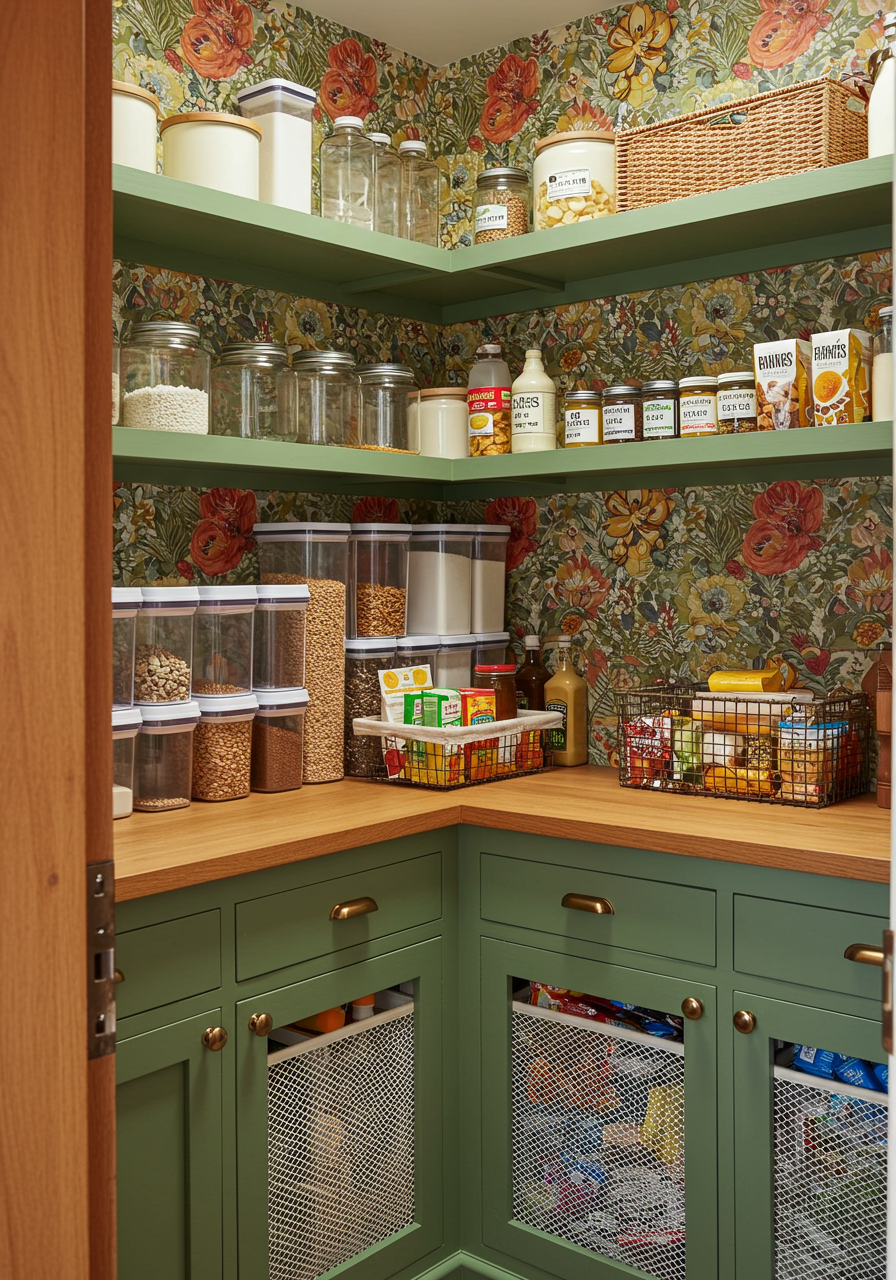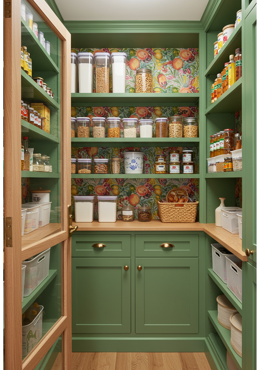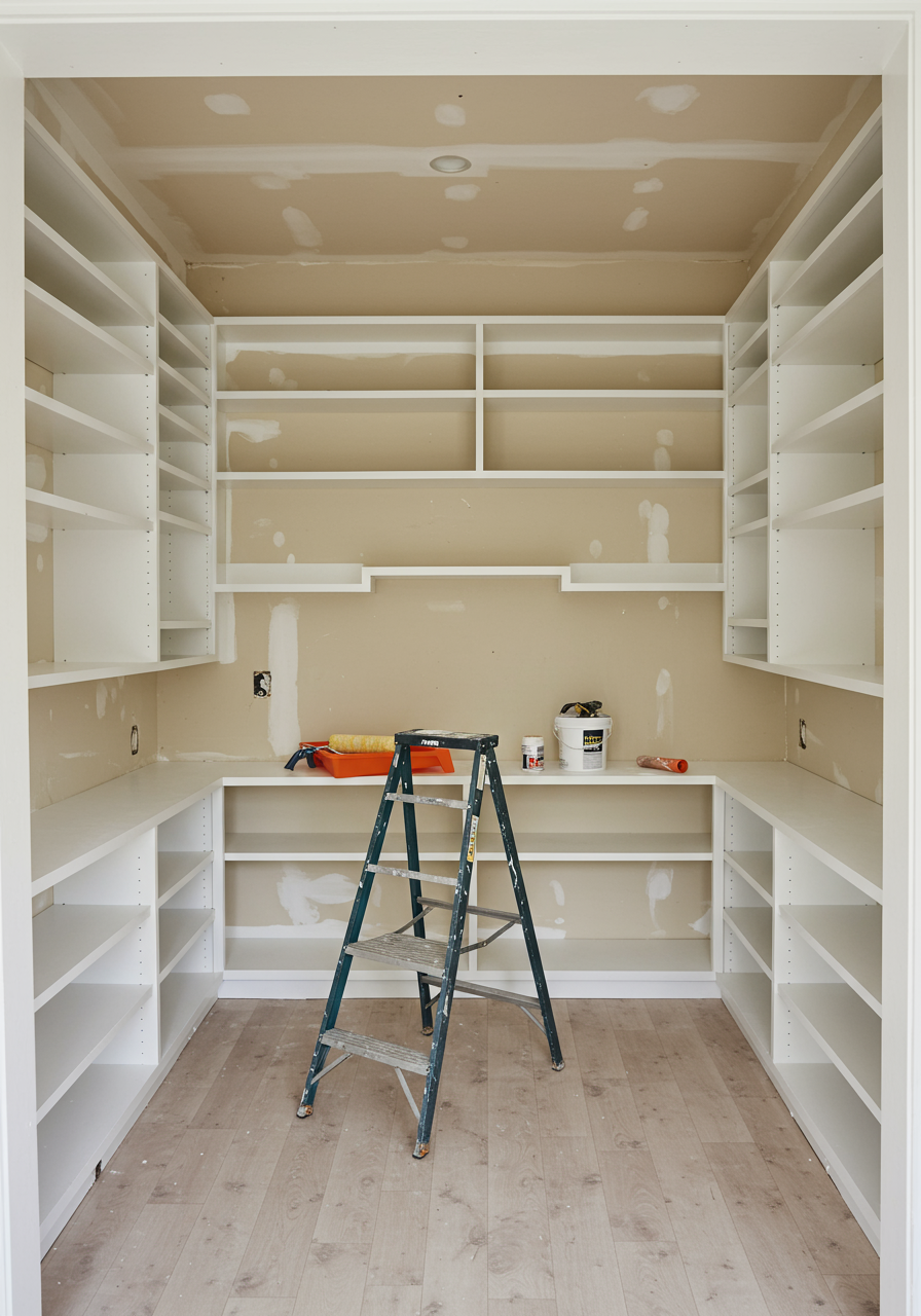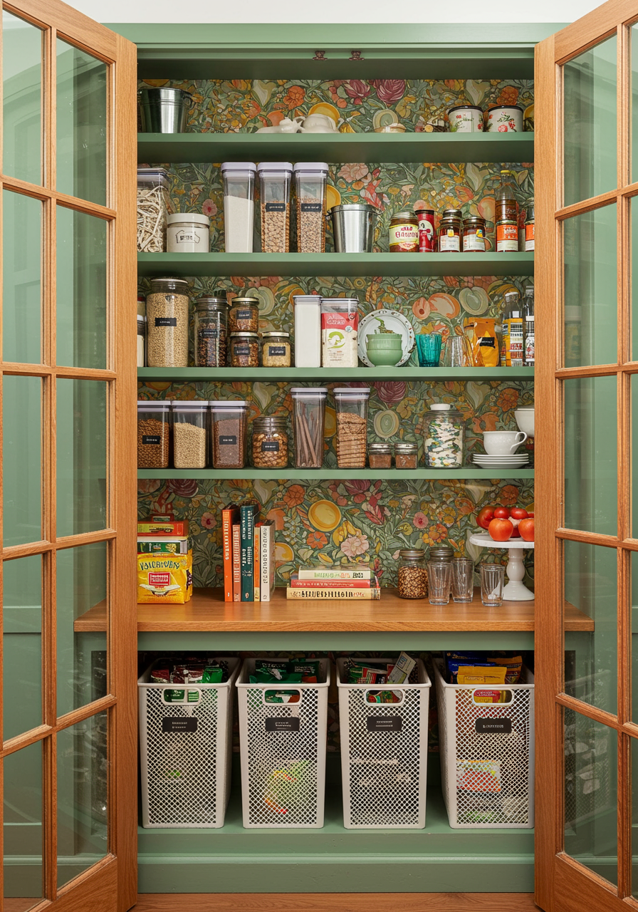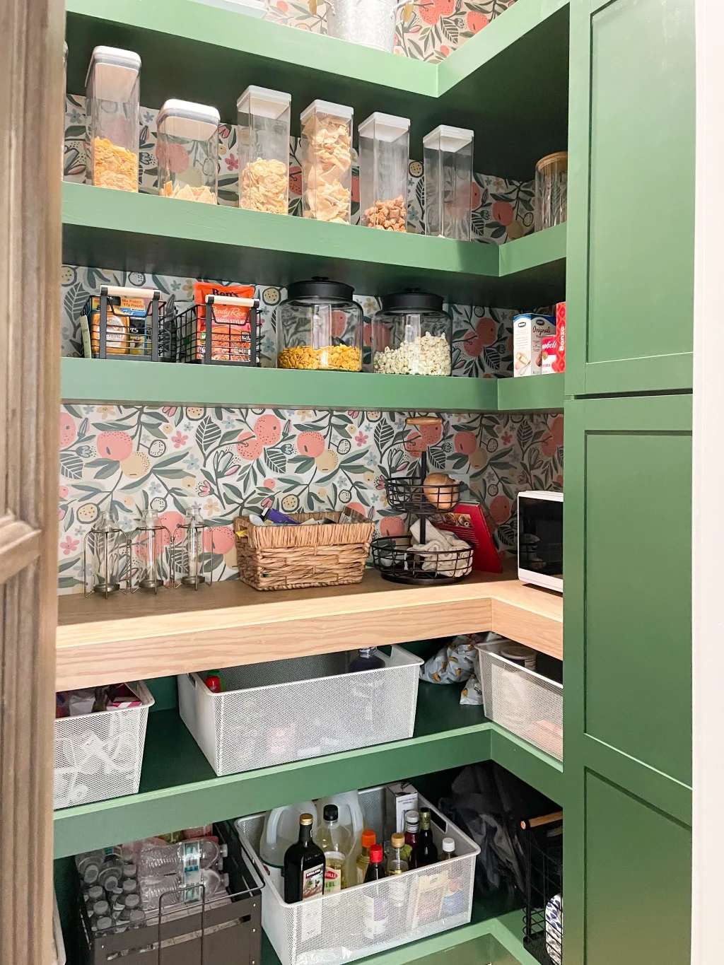 -tall cleaning items, like our Dyson handheld, broom, mop, etc. -medicines and first aid -bulk paper goods -small kitchen appliances like our kitchen aid mixer, air fryer, crock pot, etc -kids snacks -everyday dry and canned goods in tall and short storage containers-fruit basket -microwave.
