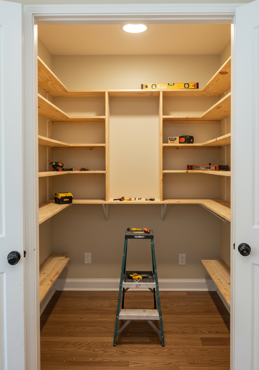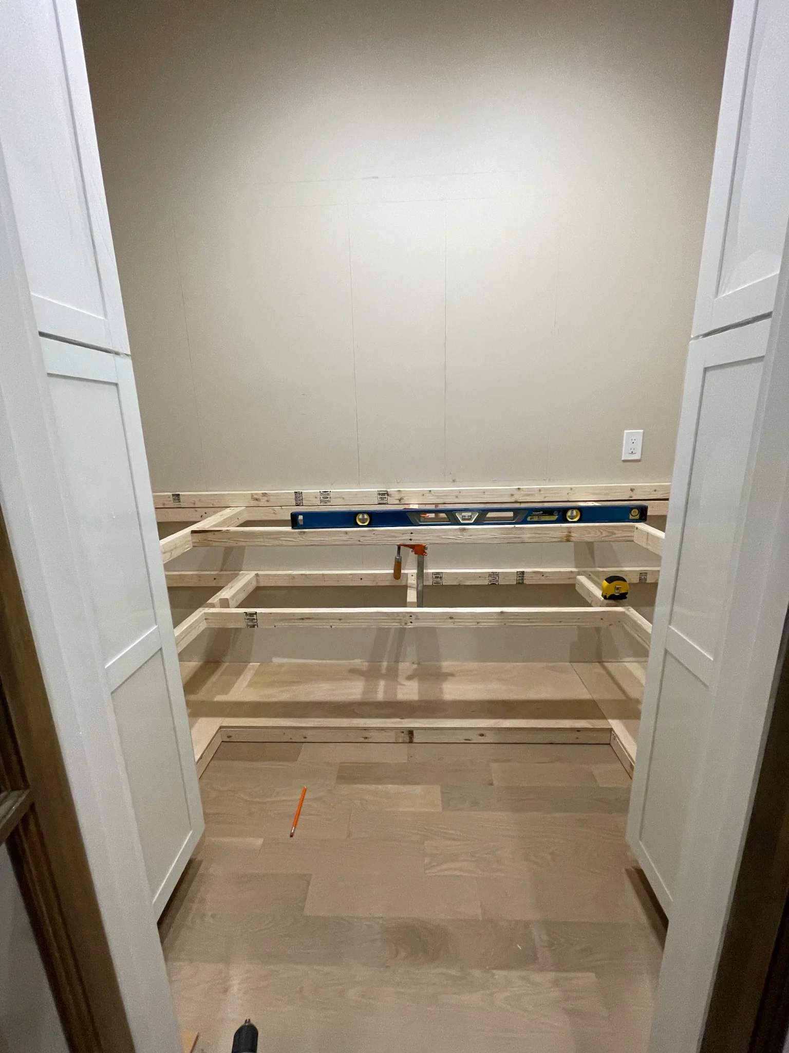 First, Mike installed nailer panels to the walls, finding a stud. Then he installed the tall anchor cabinets to those nailers. Once those were set, he built a base frame for the lower shelving using 2x4s.