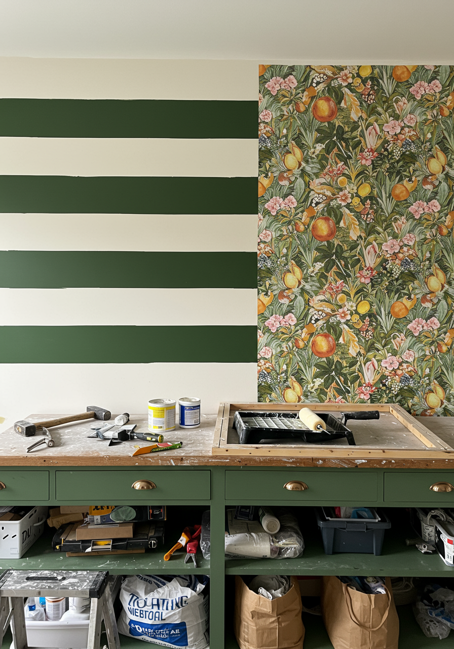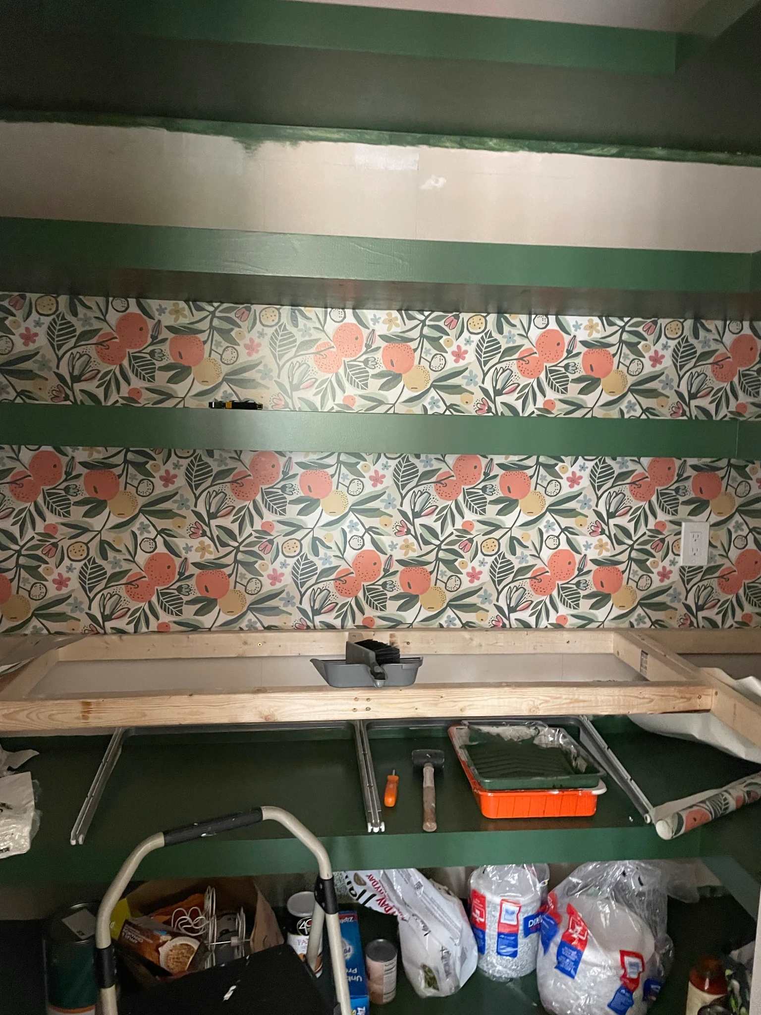 I then painted the shelves and cabinets of Martha’s Vineyard by Benjamin Moore. I found a fun removable wallpaper and this was the perfect green to complement the print. After 2 coats, I wallpapered.