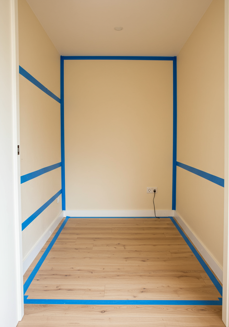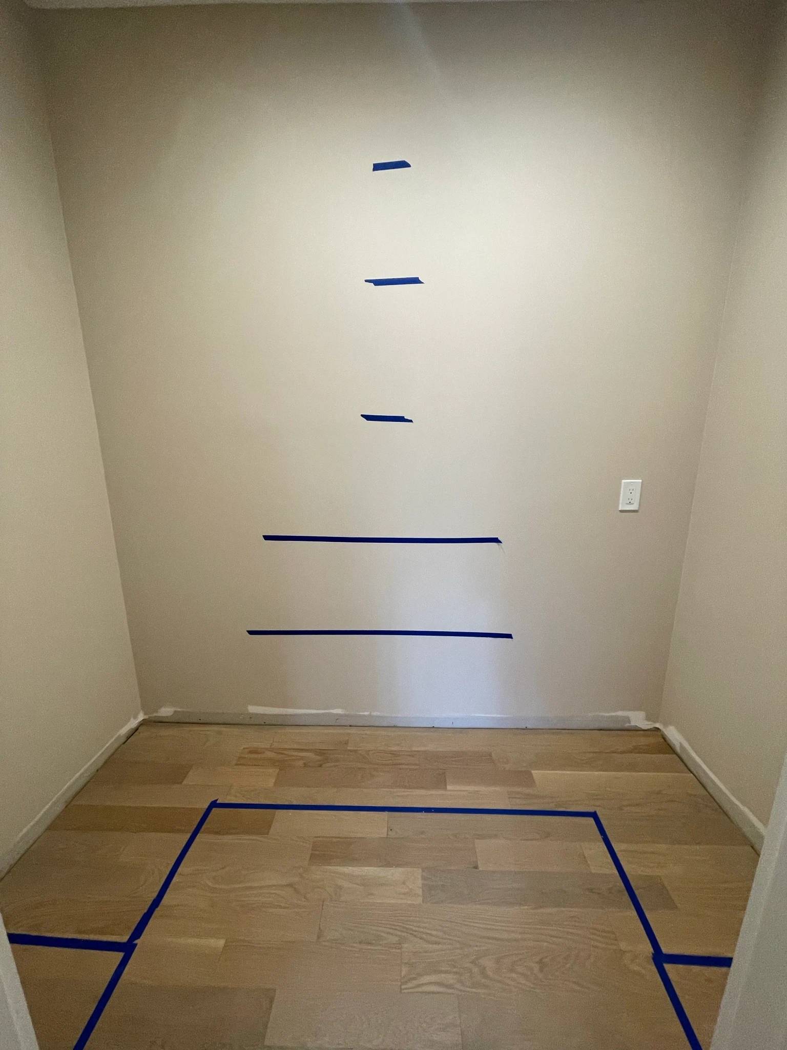 Use painters tape to mark out the footprint, shelf height, counter height, and upper shelving rows