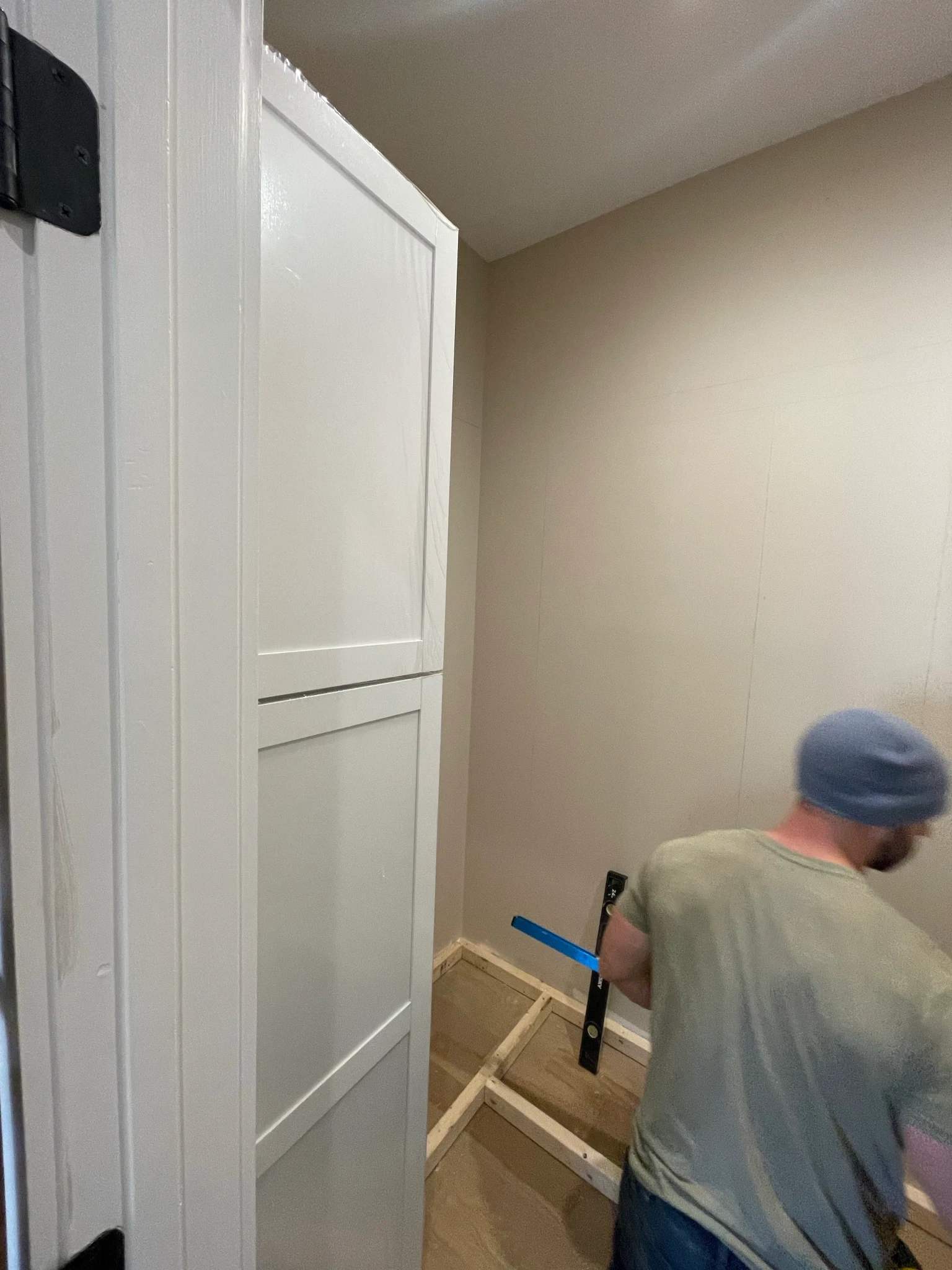 Knowing that each anchor cabinet would be 18 wide x 24 deep, we measured out the remaining space and assigned materials accordingly. We also had the electrician wire for outlets knowing what the layout would end up like. We added one at counter height, and one in the anchor cabinet to plug in the vacuum.