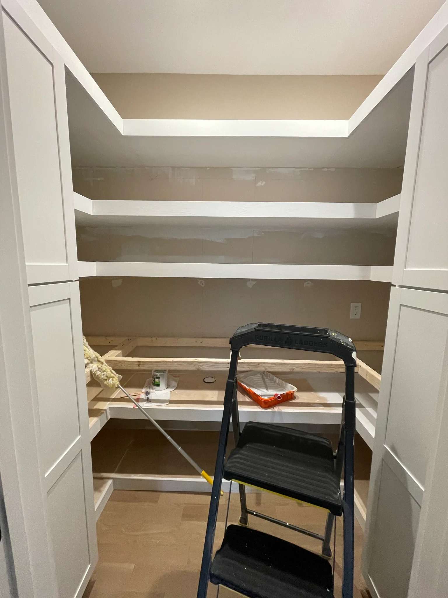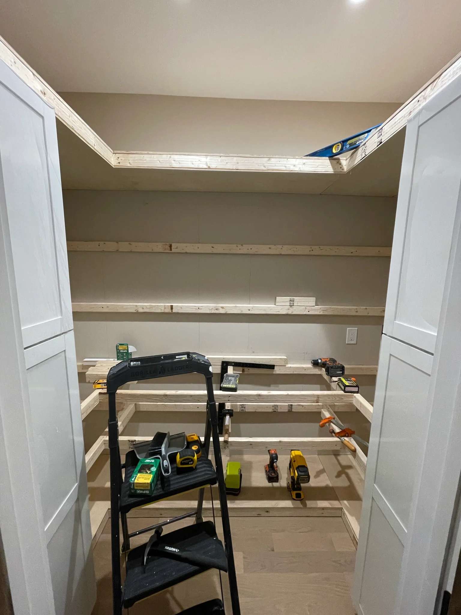 If we had to do this again, I would have used Ikea 90” cabinet frames as the anchors. They were out of stock when we built, but it would have been since to have flexibility with shelf spacing. The cabinets we used have one fixed shelf that restricts the height of what you can store in the lower section.